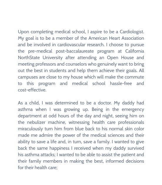 See, academic performance is not enough reason to pursue a med study. You also need to show how your personal and emotional inclinations suit a med career. Besides that, you have to reveal your future projections and how you want to impact the field. Don’t know how to do all of this? Check out a sample here. There’s always a template you can utilize.