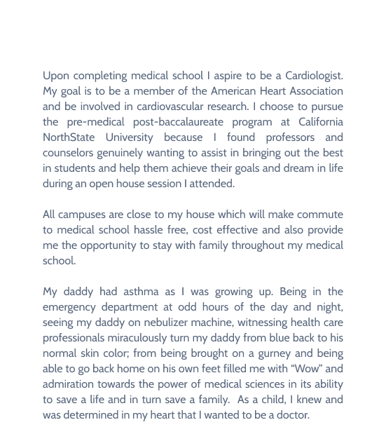 Our medical school statement of purpose examples should be used as just that, examples. They should only inspire you to write your own. If you take everything from any sample here and reproduce it, there’re high chances of handing a generic application. And by doing this, our examples won’t be of any benefit since your application might be rejected, at worst.