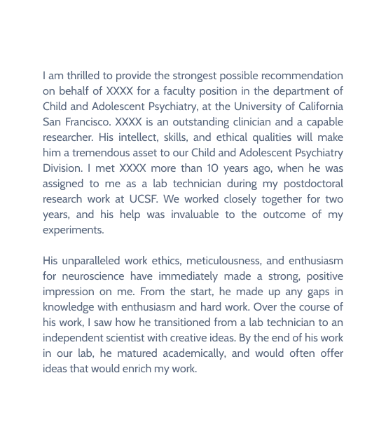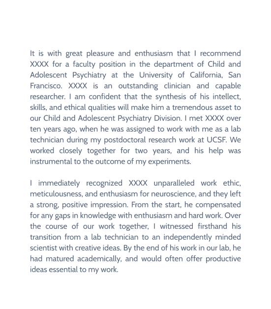Our medical school letter of recommendation examples are to be used as learning examples. It means you cannot lift everything on them and reproduce the same as your own. Most of the time, doing this will see you craft a generic document that waters down a student’s application.