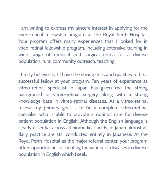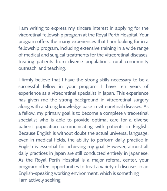 A cover letter is a vital document that can help you showcase why you are the perfect fit for the program. A well-structured cover letter should highlight your strong points, significant career and life accomplishments. A cover letter is an exclusive and personal summary of your achievements and goals. Make sure it has a catchy introduction, specific body paragraphs and succinct conclusion. Check our sample and perfect your own medical cover letter.